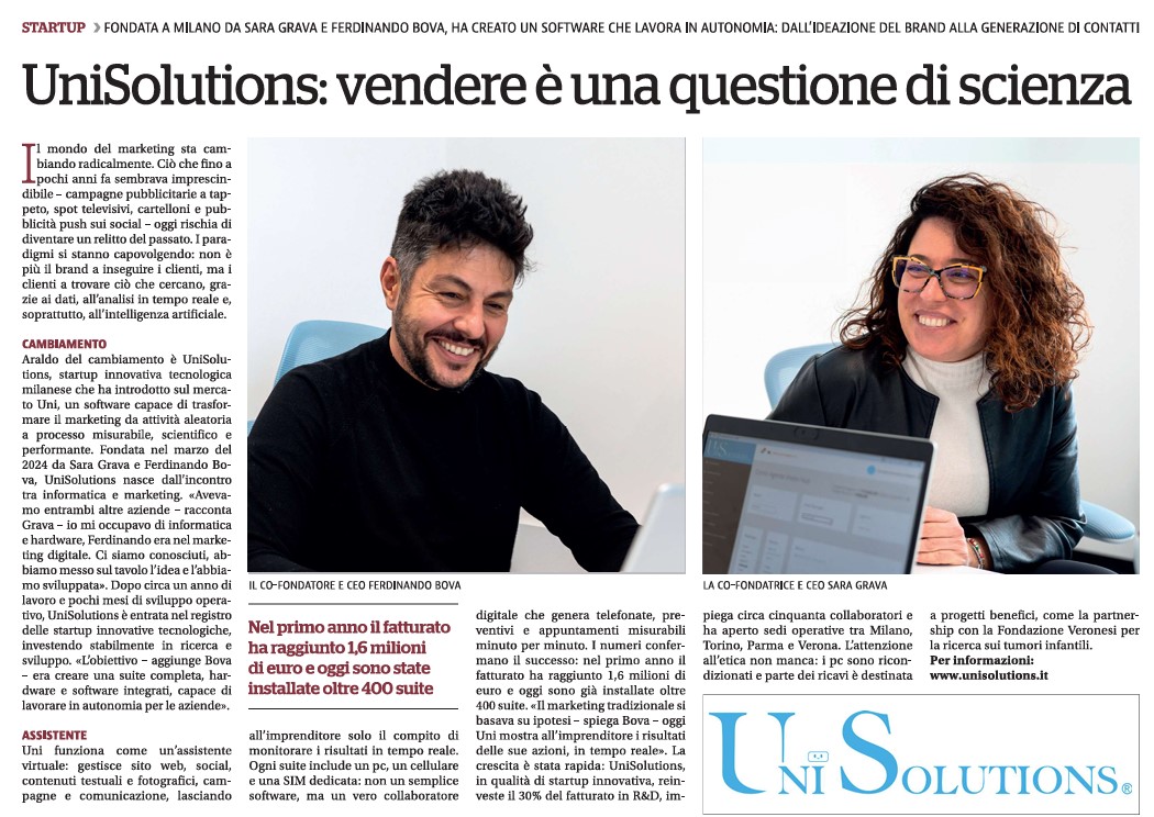UniSolutions è una startup milanese fondata da Sara Grava e Ferdinando Bova. Ha brevettato Uni, un software integrato con intelligenza artificiale generativa. In sei mesi ha superato il milione di euro e ha aperto due nuove filiali.