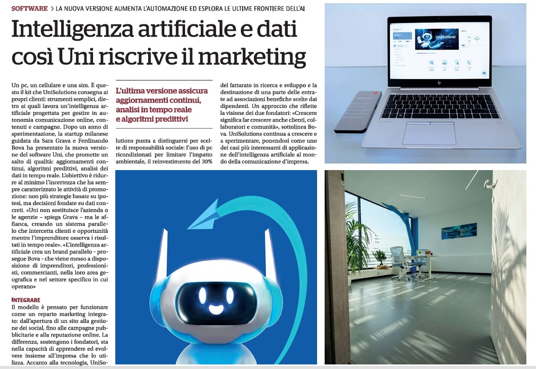 20/12/2024: "UniSolutions: nuova sede e crescita nel marketing digitale con l'IA" (da Il Giorno)